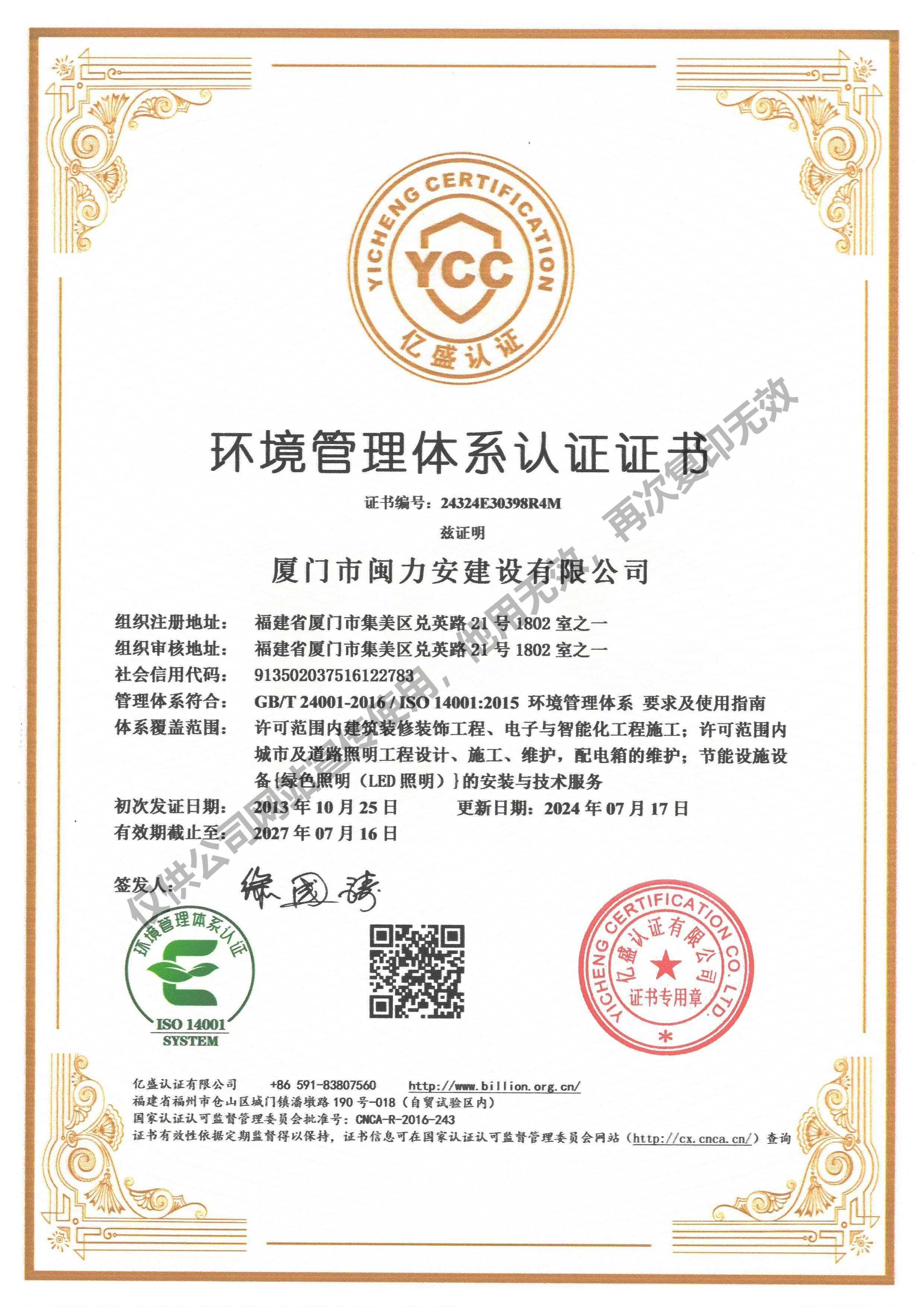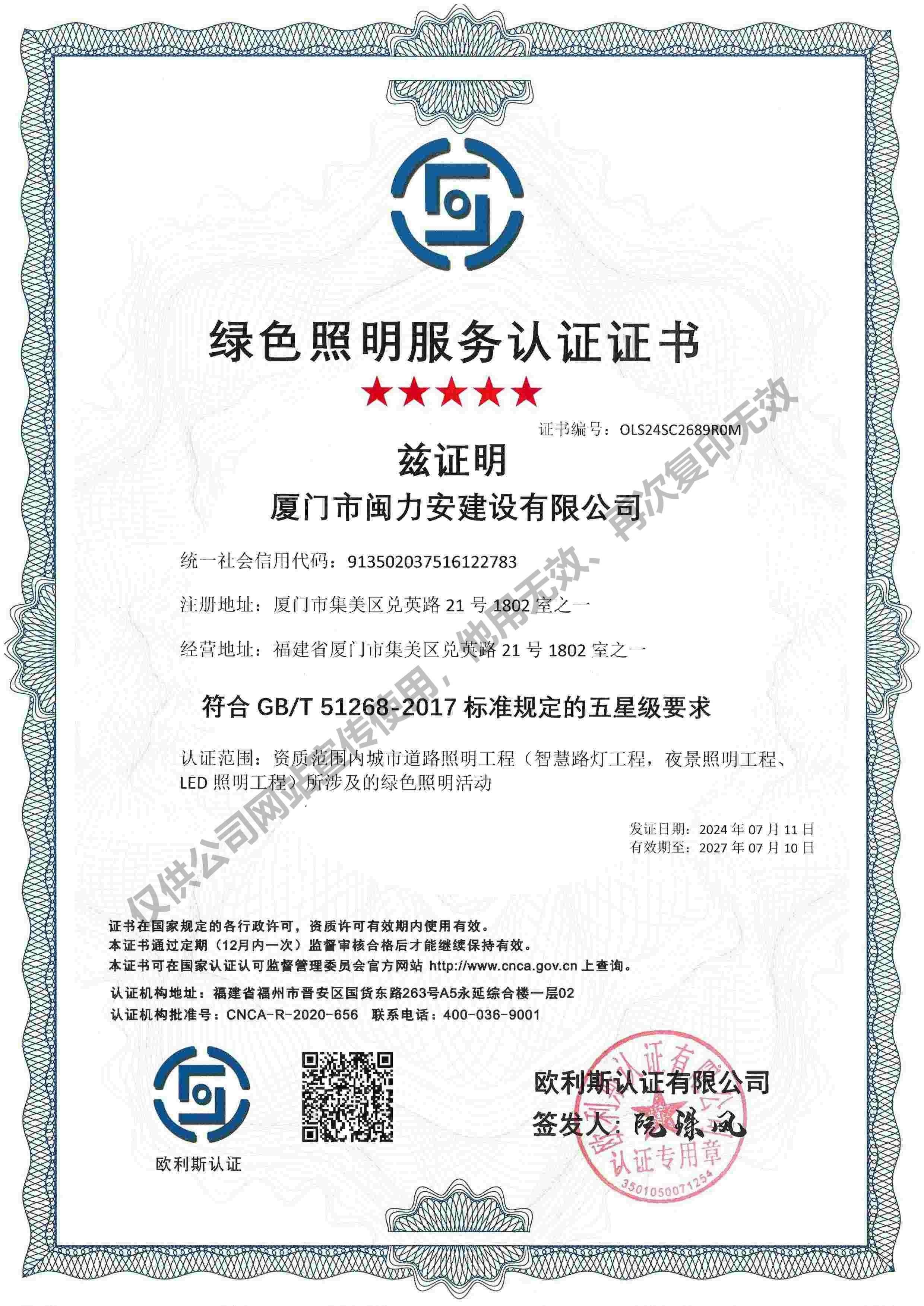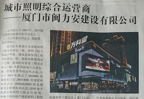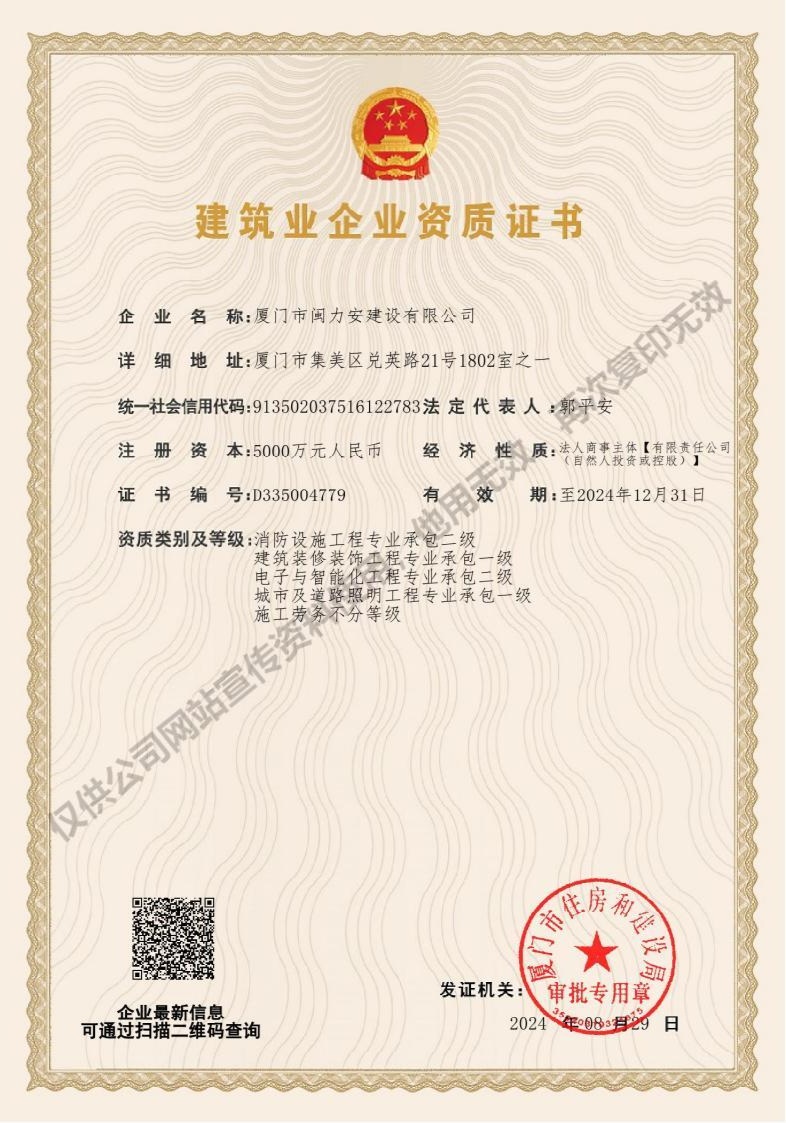 廈門(mén)市閩力安建設(shè)有限公司成立于2003年,公司取得市政公用工程施工總承包貳級(jí)、建筑裝修裝飾工程專業(yè)承包壹級(jí)、城市及道路照明工程專業(yè)承包壹級(jí)、電子與智能化工程專業(yè)承包貳級(jí)、消防設(shè)施工程專業(yè)承包貳級(jí)、電力工程施工總承包叁級(jí)、建筑機(jī)電安裝工程專業(yè)承包叁級(jí)、輸變電工程專業(yè)承包叁級(jí)、環(huán)保工程專業(yè)承包叁級(jí)、照明工程設(shè)計(jì)專項(xiàng)甲級(jí)、建筑裝飾工程設(shè)計(jì)乙級(jí)、施工勞務(wù)等資質(zhì)的綜合型企業(yè),公司于2013年通過(guò)了ISO9001質(zhì)量體系認(rèn)證,ISO14001環(huán)境管理體系認(rèn)證,OHSAS18001職業(yè)健康安全管理體系認(rèn)證。